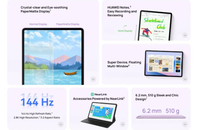 On the software side, Huawei highlights AI-powered features integrated into Huawei Notes, including handwritten text correction and equation recognition. The tablet also supports GoPaint for drawing and creative tasks and is compatible with the M-Pencil Pro stylus.
